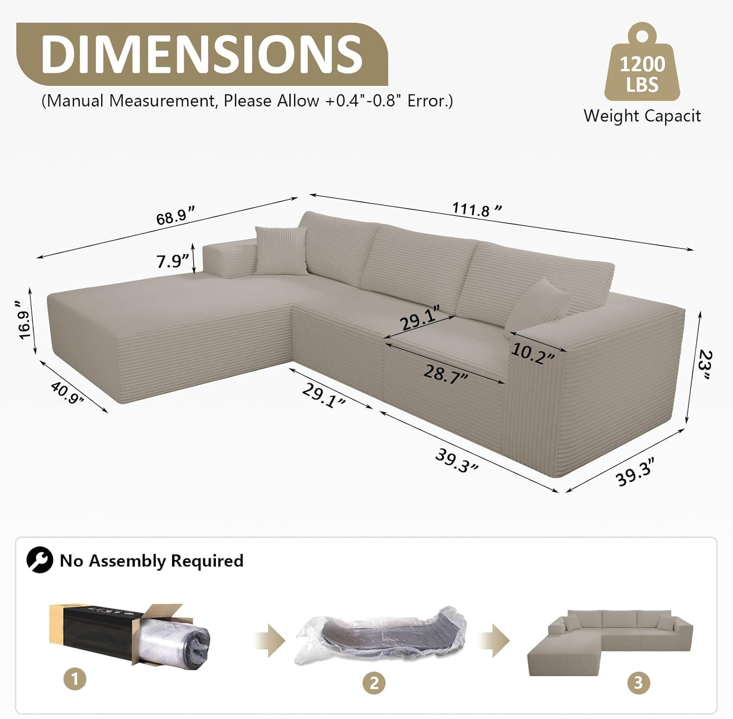 Teddy Compression Sofa Upholstered Velvet Chaise longue sofa For Four Person, High Rebound Density Sponge Sofa for Living Room, Bedroom, Apartment or Office, 284cm